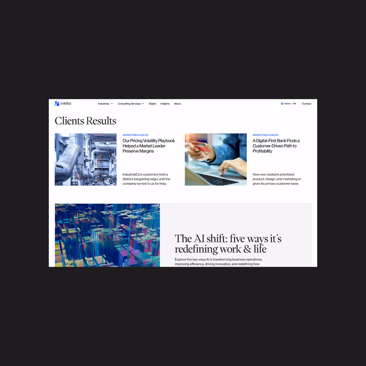 With a vast range of consulting services, VYNTEX needed a cohesive digital identity and platform that effectively communicated their depth of expertise while remaining clear and accessible.